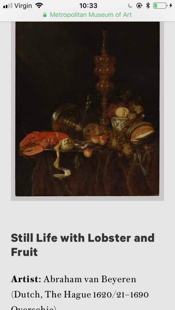 Like Jacques De Gheyns, Vanitas Still Life, 1603. This painting feels quite dark. (Maybe because both backgrounds are black?) However unlike the vanitas works, Abraham Van Beyeren’s painting ‘Still life with lobster and fruit’ feels rich and luxurious. It’s richness of colour and exquisite detail makes me feel hungry and as if this heavily laden table full of lush fruits and lobster is a banquet for for a king! I love Abraham Van Beyeren’s use of reflective surfaces of both glass and metal it just seems to emphasise these luxurious food items further. The painting doesn’t just boast of luxurious food but shows imported goods such as the blue and white porcelain bowl from China. (During this time imported goods were a sure sign of wealth.)