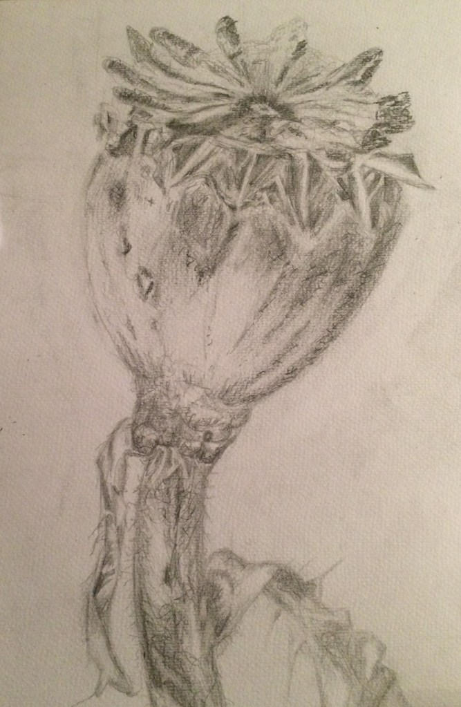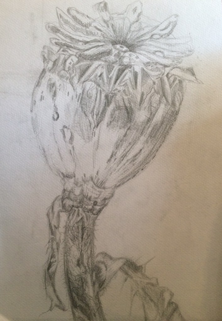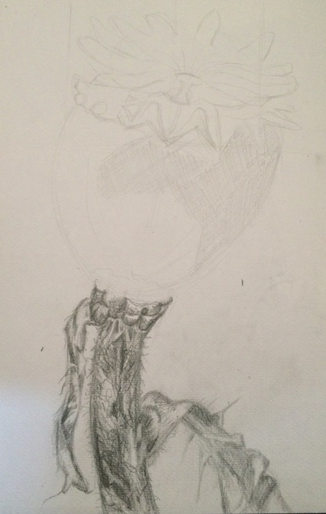 For this exercise I was asked to select a single natural object. I chose a dead rose bud from my garden. I chose this because I love all of its tiny beautiful detail, the closer I look at it the more detail I can see. I tried to introduce contrast into my drawing by using strong darks and very light tones.