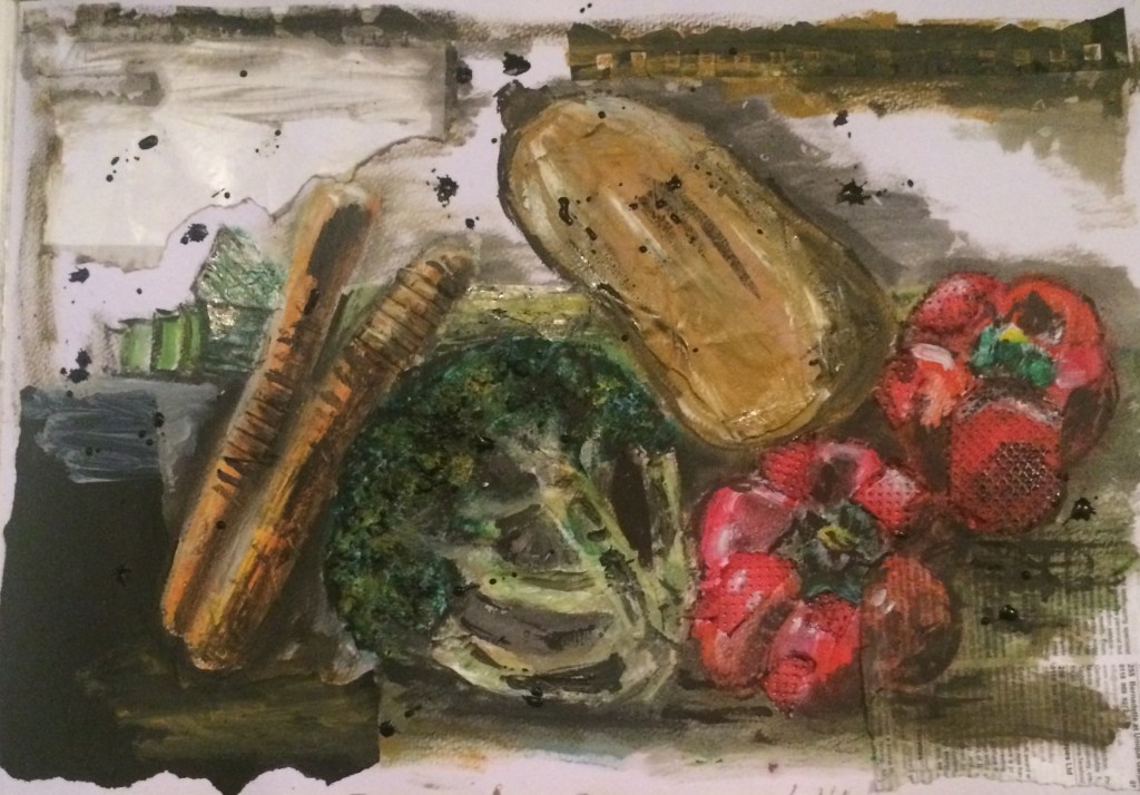 For this exercise I set up a still life of vegetables from my fridge, I found the form of these foods interesting and theirs colours vibrant and exciting- especially when placed together.