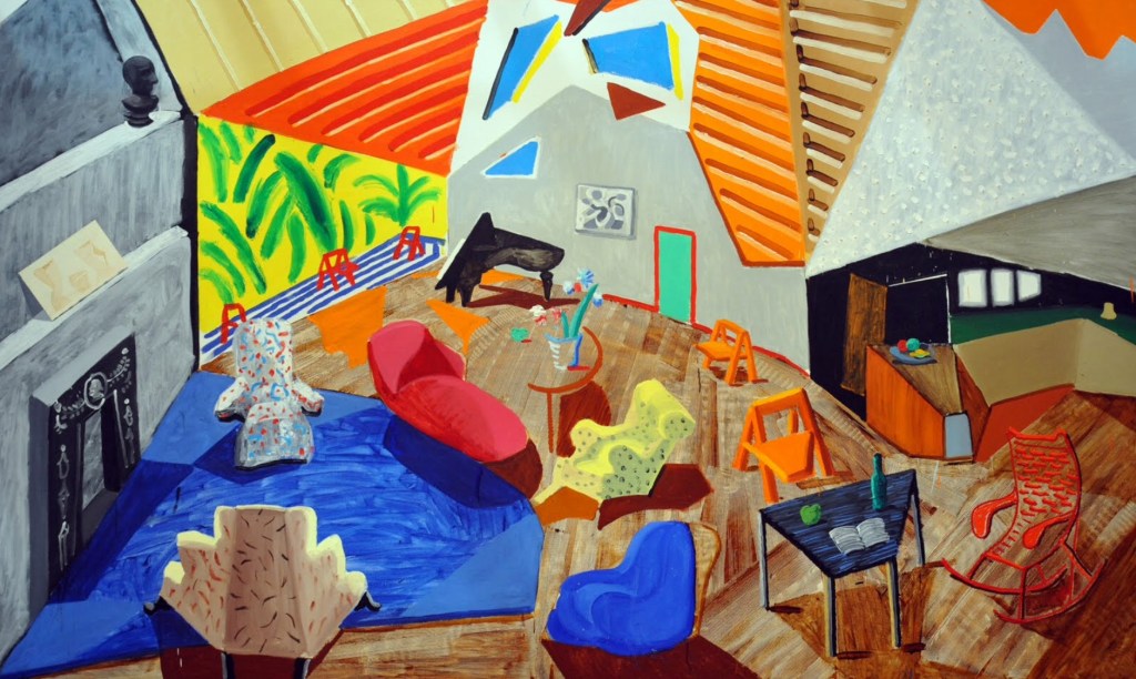 This painting also depicts Hockney’s high-ceilinged living room. However this painting shows his living room from a slightly different viewpoint or angle. It looks at the room from above, from the vaulted ceiling. However it appears that some of the furniture has been moved around (again showing the passage of time just like Van Gogh’s bedroom work.)