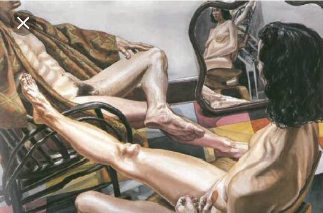This painting is of male and female nudes sitting in chairs across from each other, the males head is not in the picture and the female has her head tilted so we are unable to see her face. Opposite the female lies a mirror. (For me this is the most exciting part of the painting as it allows me, the viewer to see parts of the image I feel I am not entitled to see. It makes me feel like I am almost inside the room).The mirror also takes the painting away from just being about a portrait of the nudes to being a painting of the interior of the room, through this mirror the viewer not only gets to see the woman from a different angle but also gets to explore the rest of the room or living space.