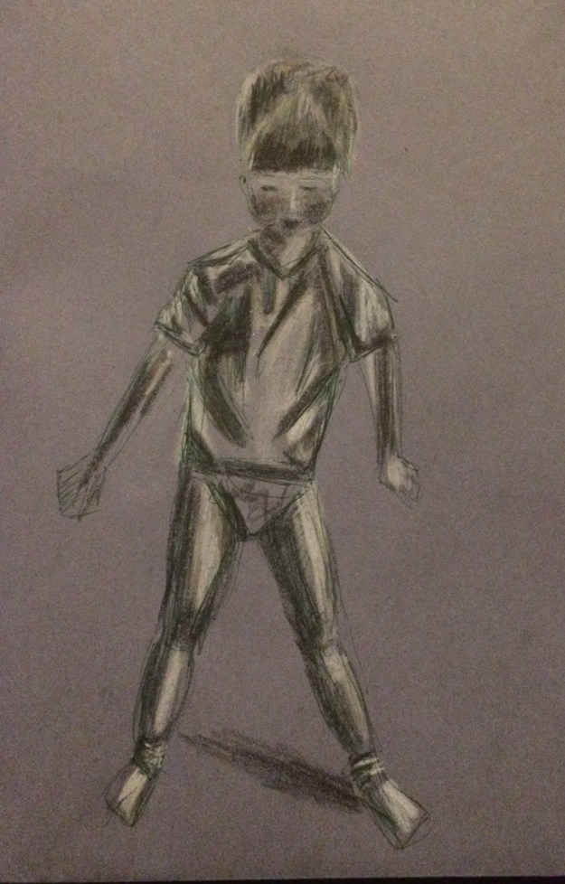 For my second drawing I started too big and only managed to fit the head and main torso in. Rather than start again I decided to carry on anyway. I experimented with lines and marks in order to show energy. However on reflection this drawing doesn’t show much energy or movement. Maybe this is because I only managed to fit in the top half of my son or maybe my marks were just ineffective at showing this?